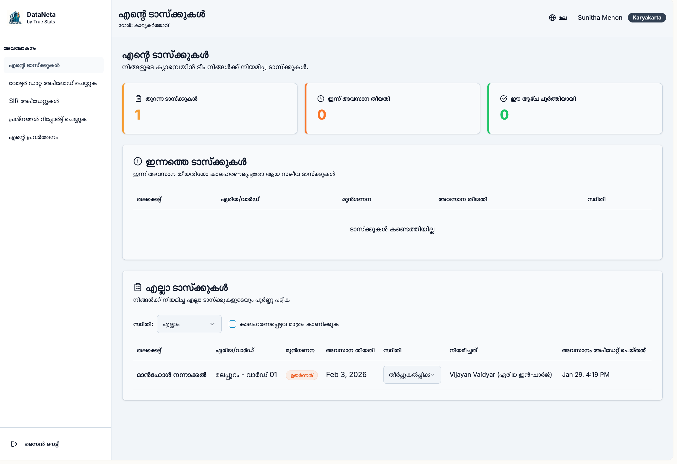 Karyakartas and area in-charges report directly from the ground. Tasks, issues, and SIR updates flow upward in a clean, auditable system.